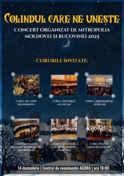 Arhiepiscopia Iașilor va organiza, în acest an, concertul „Colindul care ne unește”, duminică, 14 decembrie 2025, de la ora 18:00, la Centrul de evenimente AGORA din Iași.